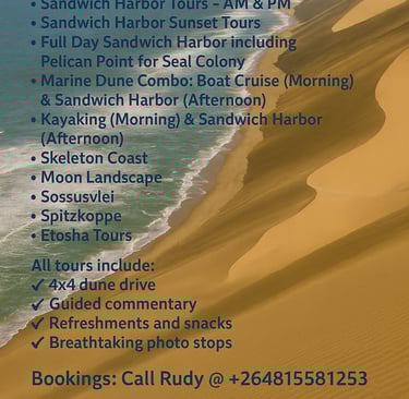 Start your day with a scenic boat cruise among dolphins, seals, and pelicans, followed by an afternoon dune adventure deep into Sandwich Harbor.